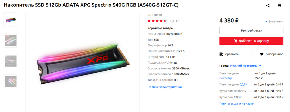 SSD: ADATA XPG Spectrix S40G RGB 512 ГБ