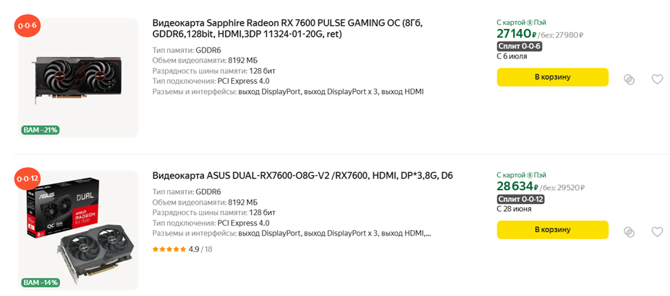 В качестве основного варианта я выбрал AMD Radeon RX 7600, поскольку ее, в отличие от RTX 4060, легко приобрести менее, чем за 30 тысяч рублей. При этом по производительности «красная» модель в сценариях без трассировки лучей примерно равна «зеленой»: в одних играх вперед вырывается одна, а в других — другая, в зависимости от движка и оптимизации. RTX 3060 тоже можно смело брать, причем как в версии с 12 гигабайтами памяти, так и в модификации с 8 гигабайтами.