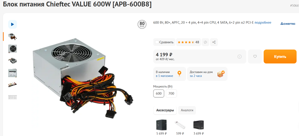 Блок питания я традиционно рекомендую от компании Chieftec – в ассортименте Deepcool и Zalman в бюджетном сегменте тоже немало приличных моделей, но в их случае все-таки надо выбирать. А в случае Chieftec можно брать буквально любую модель, подходящую (с некоторым запасом) по мощности. Конфигурация у нас нетребовательная, и ей хватило бы и 400-500 Вт, но, если БП на 600 Вт с хорошими электрическими характеристиками предлагается всего за 4 тысячи рублей – лучше приобрести его. По линии 12В у APB-600B8 552 Вт, и это для бюджетного блока питания совсем неплохо. К дополнительным плюсам решения можно отнести тихий вентилятор, приличную стабильность напряжений и высокий уровень надежности. А вот ожидать сверхвысокого КПД, отстегивающихся кабелей или подсветки не стоит — за такие опции приходится переплачивать, причем чаще всего значительно.