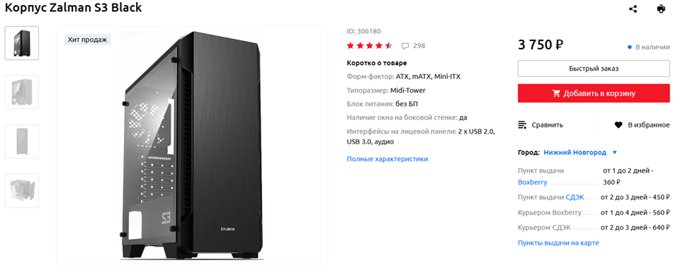 И последний в списке комплектующих — корпус. На рынке присутствует немало игровых Midi-Tower шасси стоимостью до 5 тысяч рублей, но большинство из них обладают серьезными недостатками вроде плохой организации пространства, стучащих вентиляторов или полного отсутствия пылевых фильтров. В свою очередь, такой кейс, как Zalman S3 подобных минусов лишен. Конечно, стенки у него тоже тонкие, а боковое окно выполнено из акрила, а не из закаленного стекла, но чего вы хотели менее, чем за 4 тысячи рублей в 2024 году? Зато есть один предустановленный вентилятор и слоты для установки еще нескольких, свободного места хватает, да и базовый комплект пылевых фильтров вкупе с какой-никакой системой прокладки кабелей присутствуют. Проще говоря, за свои деньги – вариант очень и очень хороший.