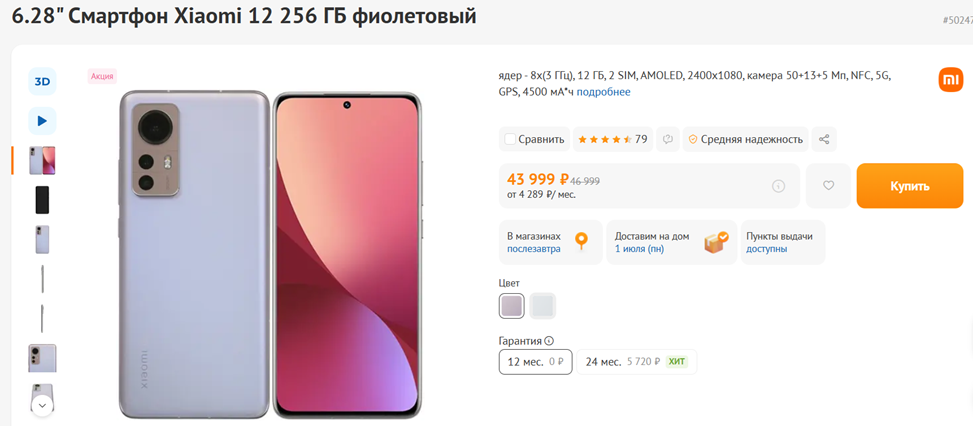 Xiaomi 12 – смартфон далеко не новый, он вышел в 2022 году, и по-умолчанию функционирует на основе аж 12 версии Android с MIUI 13. Впрочем, переживать не стоит – аппарат можно обновить до Android 14 и HyperOS, а в будущем – и до HyperOS 2.0. Устройство базируется на SoC Qualcomm Snapdragon 8 Gen 1 и в свое время считалось субфлагманом, ну или компактным флагманом — выше его в «табели о рангах» располагались только Xiaomi 12X и Xiaomi 12 Pro. Сейчас по производительности модель уже не тянет на полноценный флагман, но по-прежнему подходит для гейминга. А еще у рассматриваемого смартфона шикарная основная камера — ощутимо лучше, чем у Poco F5/F6/X6 Pro. Память стоит помедленнее, чем у более новых девайсов, LPDDR5 и UFS 3.1, но это не критично. А вот что может многих не устроить – так это автономность. Емкость аккумуляторной батареи у Xiaomi 12 по нынешним меркам скромная – всего 4500 мА*ч. Хорошо, что поддерживается 67-ваттная зарядка.