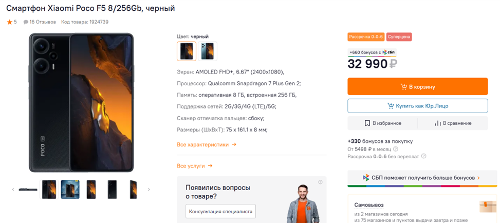 Не уверен, есть ли сейчас смысл приобретать Poco F5 – сам по себе смартфон весьма хорош, но после выхода F6 он уступает новинке по соотношению стоимости и характеристик. Полагаю, брать прошлогодний аппарат будет иметь смысл, когда он подешевеет до 27-28 тысяч рублей. Ну или с использованием всевозможных акций, промокодов и бонусов. Модель базируется на SoC Qualcomm Snapdragon 7+ Gen 2, выдающей около 1 миллиона баллов в популярном бенчмарке Antutu. Этот чип можно сравнить, например, со Qualcomm Snapdragon 8 Gen 1. Как и другие модели F-линейки Poco F5 может похвастаться качественным AMOLED-дисплеем (FullHD+, 120 Гц) и поддержкой ускоренной зарядки мощностью до 67 Вт – соответствующий адаптер поставляется в комплекте. Кстати, в отличие от F6, модель лишена проблем с датчиком приближения, хотя это вряд ли можно назвать каким-то особенно важным плюсом.