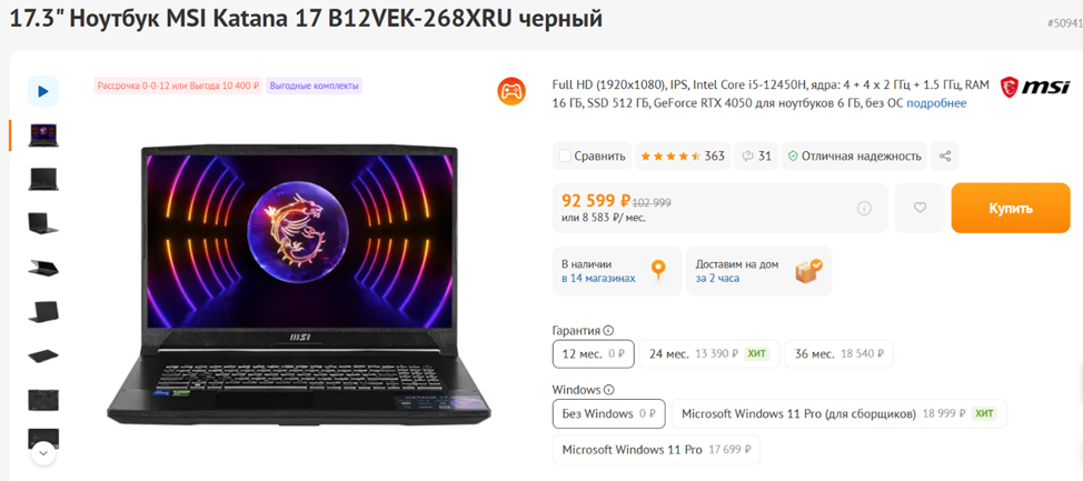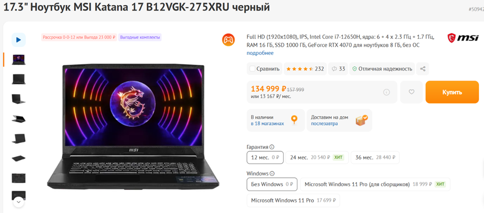 Мобильная видеокарта NVIDIA GeForce RTX 4050, конечно, уступает мобильной RTX 4060, но разница между этими GPU не столь велика, как между RTX 4060 и RTX 4070. Главными минусами ноутбучной «четыре тысячи пятидесятой» являются 6 гигабайт видеопамяти вместо 8 и урезанная до 96 бит шина. Но если вы играете достаточно редко или предпочитаете нетребовательные, а возможно, не самые новые игры, это не станет для вас проблемой. Из мобильных ПК стоимостью около 90 тысяч рублей, оснащенных RTX 4050, можно порекомендовать, например, MSI Katana 17 B12VEK-268XRU — это крупный 17.3-дюймовый ноутбук, в основе которого лежит процессор Intel Core i5-12450H с 4 производительными и 4 энергоэффективными ядрами. Носить такой с собой в ручной клади неудобно, а вот перемещать в рамках квартиры/дома или перевозить на машине — вполне комфортно. Модель подходит как для повседневной работы и интернет-серфинга, так и для гейминга, хотя на максимальные настройки с трассировкой лучей в требовательных проектах рассчитывать, конечно, не стоит.