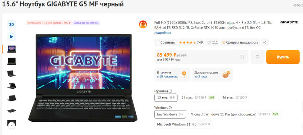 GIGABYTE G5 MF по характеристикам выглядит даже лучше, чем рассмотренный ранее ноутбук MSI, при этом приобрести его можно за меньшие деньги. Модель базируется на процессоре Intel Core i5-12500H, обладающем 4 производительными ядрами с поддержкой мультипоточности и 8 энергоэффективными без оной. Видеокарта — мобильная RTX 4050 (а десктопной и не существует) с 6 гигабайтами памяти. Оперативной памяти, как обычно, 16 гигабайт, SSD – полутерабайтный. Ну и, конечно, экран — FullHD, 144 Гц, на основе IPS-матрицы с точной цветопередачей и широкими углами обзора. За свои деньги это один из лучших мобильных ПК, хотя ему, как и другим бюджетным и среднебюджетным игровым лэптопам не хватает памяти. Некоторые игры используют уже более 20 гигабайт ОЗУ и занимают свыше 150-200 гигабайт на твердотельном накопителе.
