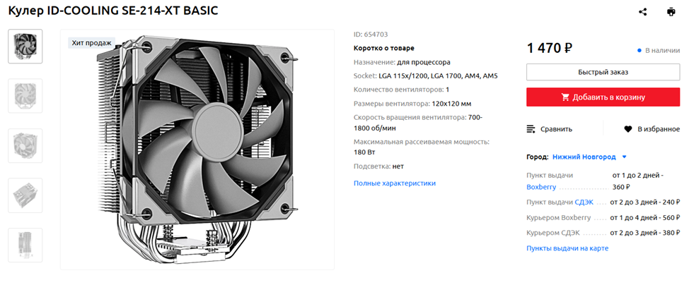 AMD Ryzen 5 5600 – по современным меркам достаточно холодный и нетребовательный к системе охлаждения процессор. Но это не значит, что стоит обходиться боксовым кулером — башенные охладители от сторонних фирм справляются со своей задачей гораздо лучше, и, что немаловажно, работают намного тише. Среди кулеров стоимостью около полутора тысяч рублей могу порекомендовать ID-COOLING SE-214-XT BASIC – как и многие другие решения китайской компании, модель может похвастаться весьма привлекательным соотношением стоимости и характеристик. А еще она поместится почти в любой игровой Midi Tower корпус. Если в вашей локации нет систем охлаждения ID-Cooling – присмотритесь к другим похожим по спецификациям решениям, например, DeepCool GAMMAXX 400 V2.