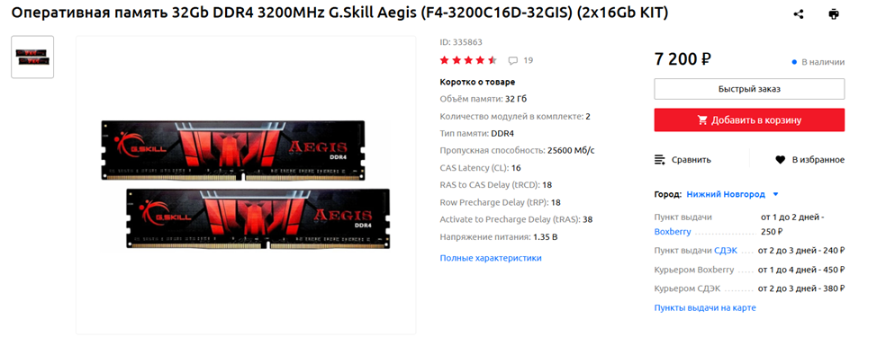 Наиболее выгодно покупать готовый комплект из двух модулей с частотой 3000-3200 МГц и таймингами 16-18-18 или 16-20-20. Подойдет, например, изображенный на скриншоте выше набор G.Skill Aegis, но вы можете взять и любой другой от проверенного временем производителя. Малоизвестных китайских брендов и продукции Noname-фирм желательно избегать – такие компании могут использовать дефектную, не прошедшую внутренний контроль качества память.