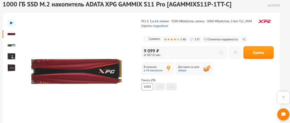 SSD: ADATA XPG GAMMIX S11 Pro 1 ТБ