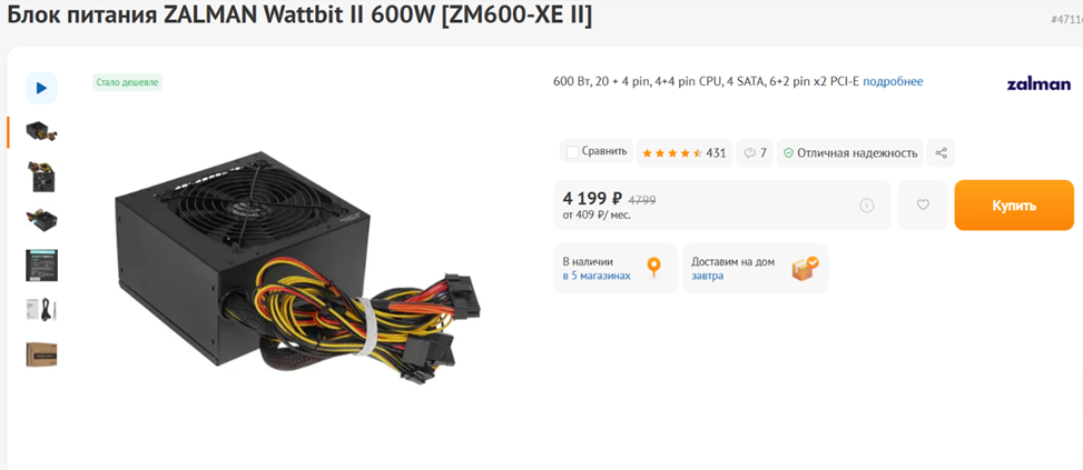 Энергопотребление нашей конфигурации по меркам современных игровых компьютеров можно охарактеризовать как невысокое – блока питания мощностью 500 Вт хватило бы с запасом. Но какой смысл приобретать 500-ваттный БП, если 600-ваттный, не уступающий ему по каким-либо важным характеристикам, стоит столько же? В бюджетном ценовом сегменте стоит обращать внимание на решения таких брендов, как Chieftec, Zalman, DeepCool. Для сегодняшней сборки предлагаю использовать модель ZALMAN Wattbit II ZM600-XE II, которая может похвастаться высокой надежностью и приличными электрическими характеристиками, включая стабильность напряжений. Вентилятор у рассматриваемого БП также достаточно тихий. Рассчитывать на стильные черные плоские кабели, тем более, отстегиваемые, или красочную подсветку не стоит, но со своими основными задачами устройство вполне справляется.