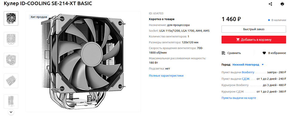 AMD Ryzen 5 5600 – процессор по нынешним меркам совершенно не горячий, и ему с большим запасом хватит башенного кулера стоимостью около полутора тысяч рублей, если это хороший, эффективный башенный кулер с тепловыми трубками и 120-миллиметровым вентилятором. Например, ID-COOLING SE-214-XT BASIC – даже если китайский производитель немного приукрасил его возможности, и для TDP 180 Вт модель слабовата, с нашим шестиядерником она справляется без проблем, причем далеко не на максимальных или околомаксимальных оборотах. На низких же и средних оборотах вентилятор системы охлаждения работает очень тихо. Если конкретно предложенной мной модели в вашей локации нет в продаже, можно рассмотреть и другие кулеры ID-Cooling, совместимые с сокетом AMD AM4, или, например, приобрести похожий по характеристикам воздушный башенный охладитель DeepCool Gammaxx 400 V2.