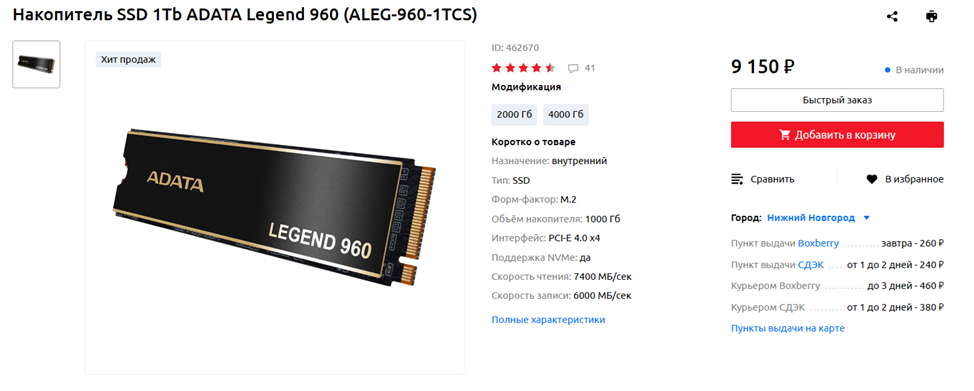 Как я уже предупреждал ранее, терабайтного твердотельного накопителя активному геймеру вряд ли хватит надолго, поэтому в будущем желательно докупить второй SSD – двухтерабайтный или даже четырехтерабайтный. Изначально же ограничение по бюджету вынуждает нас смотреть именно в сторону терабайтников. Из не особо дорогих, но, при этом, качественных, надежных и быстрых накопителей с DRAM-буфером я могу порекомендовать модель ADATA Legend 960. Она стоит значительно дешевле, чем Samsung 980 Pro, WD Black 850X или Kingston Fury Renegade, но в практическом повседневном использовании вы вряд ли почувствуете какую-либо разницу. Разве что в специализированных тестах, бенчмарках и операциях длительного копирования, когда единомоментно идет запись десятков или даже сотен гигабайт подряд.