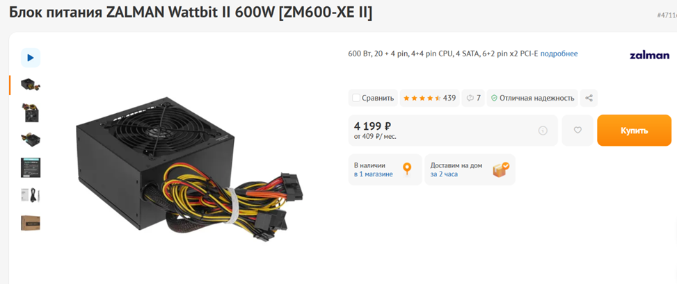 На блок питания и корпус у нас остается 8-9 тысяч рублей, но в этот бюджет вполне можно уложиться, причем не обращаясь к продукции сомнительных Noname-брендов. Например, всего за 4 тысячи рублей или чуть дороже можно приобрести добротный БП ZALMAN Wattbit II мощностью 600 Вт. На линию 12В приходится 540 Вт, чего в нашем случае более, чем достаточно – сверху останется солидный запас мощности в несколько десятков процентов. Также к преимуществам решения Zalman можно отнести высокую надежность – несмотря на общую бюджетность исполнения, блок питания, как правило, беспроблемно служит долгие годы. Вентилятор здесь тоже установлен достаточно тихий. На высокий по современным меркам КПД или отстегивающиеся кабели рассчитывать не стоит, но с основными функциями БП справляется на отлично.