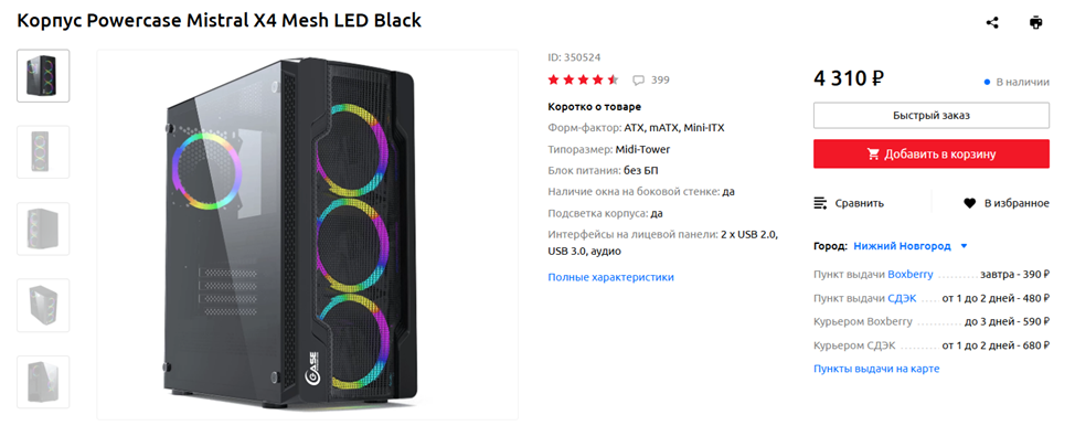 И, наконец, финальный штрих – корпус. Выбор здесь, на самом деле, достаточно широкий – например, бюджетных шасси хватает в ассортименте таких компаний, как Zalman, Deepcool и Aerocool, и среди них есть достойные варианты. Но сегодня я решил предложить кейс под названием Powercase Mistral X4 Mesh LED – он не только действительно круто выглядит, но и шикарно охлаждается благодаря четырем (!) предустановленным 120-миллиметровым вентиляторам. Боковая стенка здесь тоже не акриловая, а из закаленного стекла, что определенно добавляет корпусу очков в глазах потенциального покупателя. Имеются и базовые возможности по прокладке кабелей. А вот подсветка вентиляторов статична, настроить ее не получится. Но это уже нюансы.