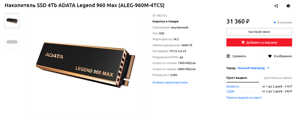 Один из наиболее доступных по цене вариантов, если говорить о четырехтерабайтниках с DRAM-буфером и с поддержкой четвертой версии интерфейса PCI-Express — это ADATA Legend 960 или он же в Max-версии, с радиатором. Покупать можно любой вариант в зависимости от того, какой будет дешевле. Кстати, приятно, что брать 4 терабайта наконец-то стало выгоднее, чем 2, хотя и ненамного, а также не во всех магазинах. Правильнее пока говорить скорее о паритете цен. Но главное, как я уже подчеркивал в предисловии, что покупка емкого накопителя позволяет сэкономить дополнительный слот.