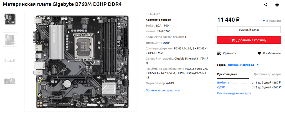 Материнскую плату для Core i5-12400F стоит взять на чипсете B760 – как ради поддержки тонкой настройки оперативной памяти, так и ради четвертой версии интерфейса PCI-Express. Обязательно убедитесь, что разъемов M.2 для SSD на борту есть хотя бы пара штук — одного твердотельного накопителя вряд ли хватит надолго, если это, конечно, не четырехтерабайтник. Но четырехтерабайтный SSD в 80-тысячный бюджет без радикальной и нерациональной экономии на других важных компонентах уместить не получится. Да и двухтерабайтный тоже. Но вернемся к материнской плате. В качестве варианта по-умолчанию для «двенадцать тысяч четырехсотого» предложу модель Gigabyte B760M D3HP DDR4, но вы можете взять и другой похожий вариант. Если же вы выбрали AMD Ryzen 5 5600 – смотрите в сторону решений на чипсете B550 с парой разъемов M.2 PCI-Express для установки скоростных SSD.