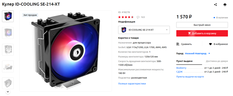 Неразгоняемому шестиядерному процессору не требуется производительная система охлаждения – хватило бы и стоковой, поставляющейся в комплекте. Но боксовая версия процессора с кулером явно не стоит переплаты – лучше приобрести кулер от стороннего производителя, который будет одновременно эффективнее, тише и дешевле. Таких кулеров на рынке полно – например, их предлагает китайский производитель ID-Cooling. Модель под названием SE-214-XT, если верить заявлениям компании, рассчитана на процессоры с TDP до 180 Вт, и даже если это некоторое преувеличение, с «двенадцать тысяч четырехсотым» кулер справляется легко. Все-таки тут и теплотрубки, и 120-миллиметровый вентилятор, да и площадь радиатора для такой цены более, чем приличная. Альтернатив в ассортименте ритейлеров тоже хватает, поэтому если в вашей локации нет ID-COOLING SE-214-XT, подобрать что-то похожее можно без проблем. Первый вариант, что приходит в голову — Deepcool Gammaxx 400 V2.