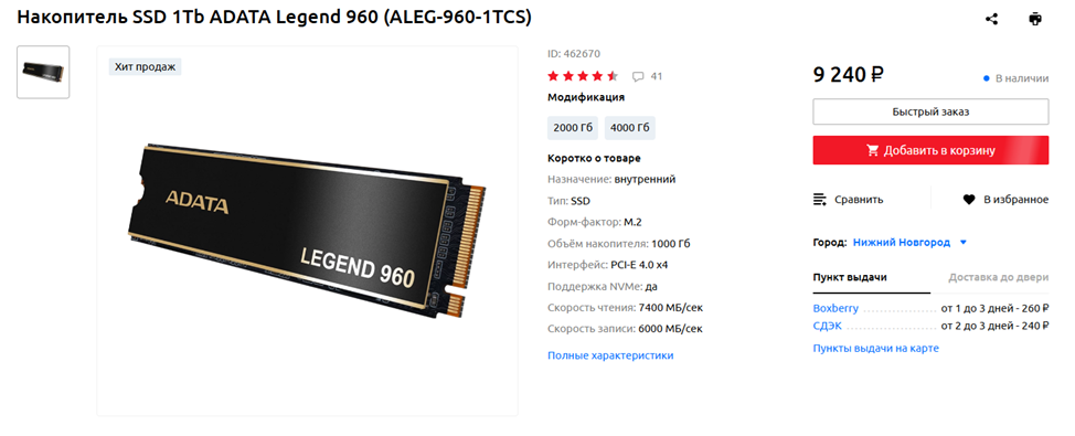 Твердотельный накопитель крайне рекомендую изначально взять как минимум на терабайт – на первое время этого должно хватить. А в будущем докупите двухтерабайтник или даже четырехтерабайтник. Свободное место на SSD имеет свойство очень быстро заканчиваться, что и неудивительно с учетом того, что современные игры могут занимать 100, 150, а то и 200 гигабайт. В качестве основного накопителя предлагаю приобрести модель ADATA Legend 960 или какой-нибудь другой PCI-Express 4.0 SSD с DRAM-буфером, демонстрирующий высокую производительность в любых реальных сценариях использования. И тот же совет, что и с оперативной памятью – избегайте Noname-брендов. Они могут использовать бывшие в употреблении, бракованные или не прошедшие контроль качества чипы памяти. Аналогично и с контроллерами. Лучше переплатить, чем внезапно лишиться ценных данных. Хотя необходимость делать бэкапы тоже никто не отменял, причем один экземпляр данных должен находиться на удаленном сервере – например, в облаке. Перед загрузкой его туда данные желательно зашифровать.