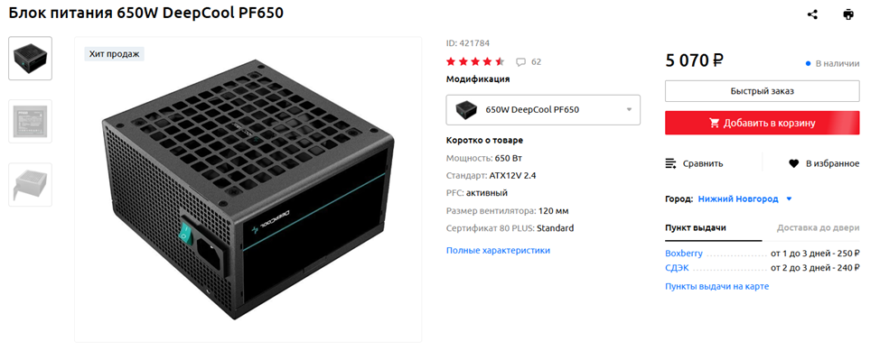 Блок питания стоит взять с запасом по мощности, на 600-700 Вт. Хорошо подойдет, например, модель DeepCool PF650, к плюсам которой, помимо честной мощности и высокой надежности, можно отнести плоские черные кабели, которые смотрятся куда эстетичнее разноцветного пучка. Да и пыль они собирают меньше. А вот возможности отстегнуть провода нет – это прерогатива решений более высоких ценовых сегментов. Впрочем, практическая необходимость в модульной системе подключения кабелей возникает только когда этих кабелей много. Здесь же набор стандартный, хотя, конечно, более, чем достаточный для нашей конфигурации. Кроме Deepcool, приличные блоки питания в бюджетном сегменте можно найти у таких производителей, как Chieftec и Zalman, но там будет тот самый разноцветный пучок проводов, который портит эстетическое восприятие ПК, если у шасси есть прозрачная боковая панель.
