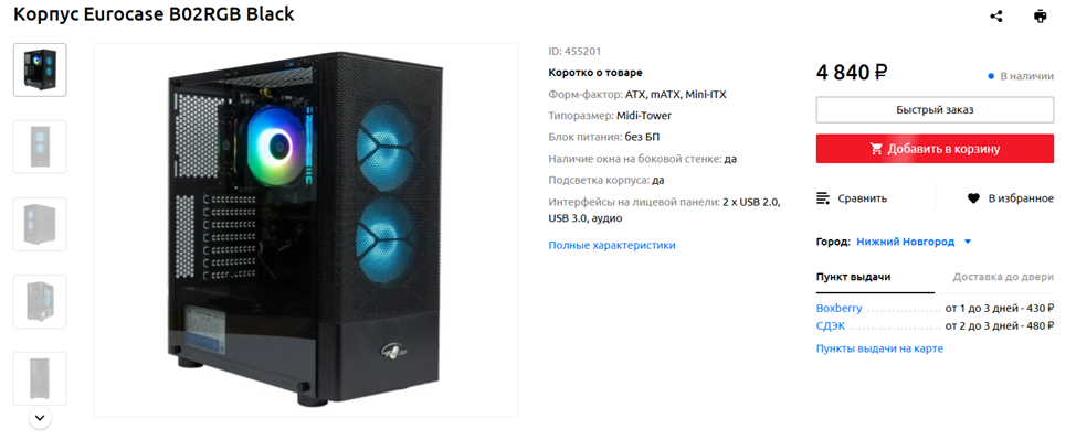 Кстати, о шасси. В сегменте «до 5 тысяч рублей» большая часть корпусов – это откровенное фуфло. Тем не менее, встречаются и качественные модели, к которым относится, например, Eurocase B02RGB с двумя предустановленными 120-миллиметровыми вентиляторами. В теории, к ним можно добавить еще несколько, но больше двух «вертушек» связке Core i5-12400F и RX 7600 не требуется. В целом же кейс можно характеризовать как продуманный и современный. Некоторое топовое железо вроде огромных суперкулеров в него, конечно, не поместилось бы, но это и не наш случай. Что же касается продуваемости – с ней все отлично, да и организация пространства неплохая. Жаль только, что производитель поскупился на пылевые фильтры — сетка в наличии только на верхней панели.