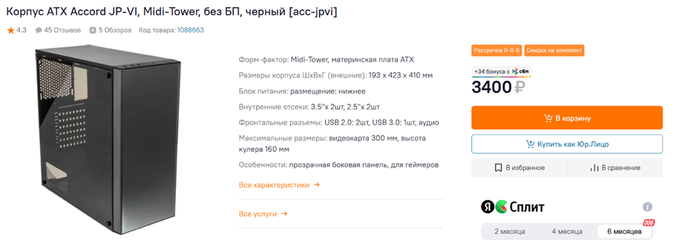 ACCORD JP-VI может послужить хорошей альтернативой предыдущей модели, особенно с учетом того, что стоит он на 600 рублей дешевле, при этом предлагая схожий набор возможностей. Даже выглядит корпус очень и очень похоже. Как и «три тысячи четыреста седьмой», он вряд ли подойдет для высокопроизводительных игровых сборок с топовым железом, но для недорогой игровой конфигурации его будет вполне достаточно, особенно если установить один-два 120-миллиметровых вентилятора. По-умолчанию нет ни одного. Боковая панель выполнена из акрила, а не из закаленного стекла, но, с учетом цены, странно было бы ожидать иного. За 3.5 тысячи на начало 2025 года вариант более, чем адекватный – если у вас сборка с низким энергопотреблением и тепловыделением, и все комплектующие поместятся, то можно брать. Но только если вы уверены, что потом не купите огроменную видеокарту, которая в этот корпус не влезет.