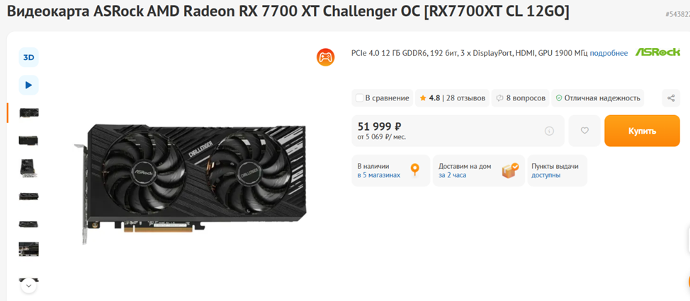Начну с AMD Radeon RX 7700 XT. Не так давно эту видеокарту можно было без особых проблем найти за 50 тысяч рублей или чуть дешевле во множестве торговых сетей, но ослабление рубля по отношению к доллару, евро и юаню сделало свое черное дело – если бюджет ограничен 50 тысячами, то теперь карту придется хорошенько поискать. Тем не менее, это однозначно лучший вариант в рассматриваемой ценовой категории, и не только из-за 12 гигабайт памяти, но и из-за уровня производительности. С «семь тысяч семисотой» вы сможете без проблем играть в любые игры в разрешении FullHD на максимальных настройках графики с комфортным FPS, хотя, конечно, без трассировки лучей. Графические ускорители AMD в принципе не очень хорошо справляются с рейтрейсингом, да и бюджет не тот. По мне, так если хочется играть с трассировкой лучей, стоит покупать как минимум RTX 4070 Super. А AMD Radeon RX 7700 XT подходит для любых игр в FullHD без трассировки, и, ограниченно, для QuadHD-гейминга.