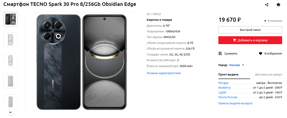 В качестве примера недорогого, но качественного и заслуживающего внимания смартфона можно привести TECNO Spark 30 Pro в версии с 8 гигабайтами оперативной памяти и 256 гигабайтами на флеш-накопителе. Аппарат базируется на SoC MediaTek Helio G100, набирающей в популярном бенчмарке Antutu около 430-450 тысяч баллов — нельзя сказать, что по современным меркам это много, но если учитывать, что мы говорим о бюджетном сегменте, то и не мало. Также модель может похвастаться 6,78-дюймовым AMOLED-дисплеем с частотой обновления 120 Гц. Радует устройство и приличными основной и фронтальной камерами, выдающими хорошего качества снимки. Емкость аккумуляторной батареи составляет 5000 мА*ч, поддерживается и 33-ваттная ускоренная зарядка. Проще говоря, перед нами отличный, сбалансированный по характеристикам бюджетник.
