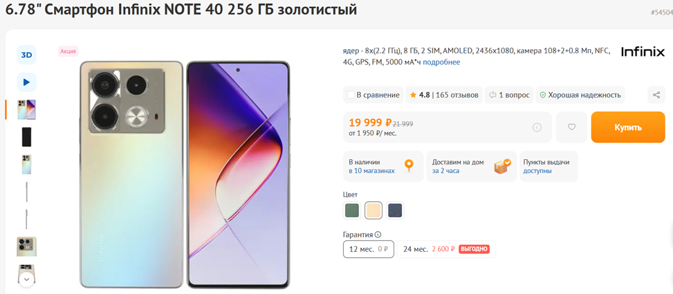 Еще один смартфон с привлекательным соотношением стоимости и характеристик — Infinix NOTE 40 8/256 ГБ. Он основан на SoC MediaTek Helio G99 Ultimate, набирающей около 420-440 тысяч баллов в Antutu. Дисплей – качественный AMOLED с разрешением 1080х2436 пикселей и частотой обновления 120 Гц. Качество фото на основную и фронтальную камеры по меркам сегмента – хорошее, на пять с минусом или четыре с плюсом по пятибалльной шкале. Емкость аккумулятора составляет стандартные 5000 мА*ч, также есть поддержка быстрой 45-ваттной зарядки. Как и TECNO Spark 30 Pro — отличный бюджетный аппарат. Примечательно, что по своим характеристикам обе модели очень похожи.