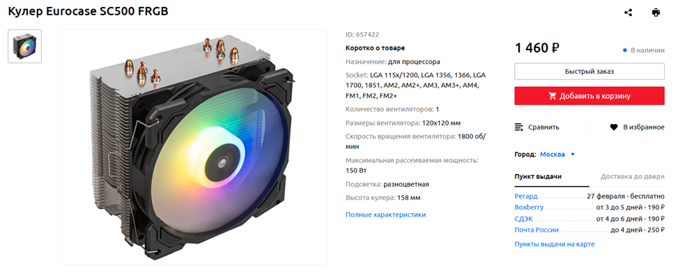 AMD Ryzen 5 5600 – по современным меркам процессор к охлаждению нетребовательный, поэтому недорогого башенного кулера с 3-4 теплотрубками и 120-миллиметровым вентилятором хватит с головой. Подойдет, например, Eurocase SC500 FRGB, но можно обратить внимание и на альтернативные варианты, включая многочисленные решения китайской компании ID-Cooling. По соотношению стоимости и характеристик они в настоящий момент одни из лучших. Что же касается упомянутого кулера Eurocase – согласно заявлениям производителя, он рассчитан на процессоры с TDP до 150 Вт, а значит, нам вполне подходит. Подойдут и другие модели с заявленным TDP от 140 до 180 Вт. Но вот системы охлаждения с более мелкими, чем 120-миллиметровые, вентиляторами брать не советую – они, как правило, слишком шумные, потому что 92-миллиметровой «вертушке» для обеспечения серьезного воздушного потока нужно раскрутиться до более высоких оборотов, чем 120-миллиметровой.