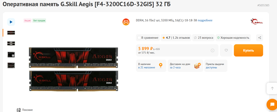В предыдущие месяцы я предлагал устанавливать в конфигурацию за 60 тысяч рублей одну планку памяти на 16 гигабайт и в ближайшем будущем докупать вторую такую же. На этот раз укрепление рубля и удешевление комплектующих позволяет сразу приобрести 32-гигабайтный комплект из двух модулей ОЗУ. Оптимальный вариант с точки зрения соотношения стоимости и характеристик – это набор DDR4-3200 с таймингами 16-18-18 или 16-20-20. И никакого Noname-Китая с маркетплейсов, только проверенные бренды. Считать ли Netac проверенным я еще не решил — в магазинах, судя по отзывам, эту память брать можно, а вот на всяких Озонах и Алиэкпрессах наверняка полно подделок. Так что лучше ограничиться ассортиментом G.Skill, Kingston, Patriot, XPG, ADATA, HP, Samsung, Crucial, Hynix, Micron, Silicon Power и еще ряда авторитетных брендов.