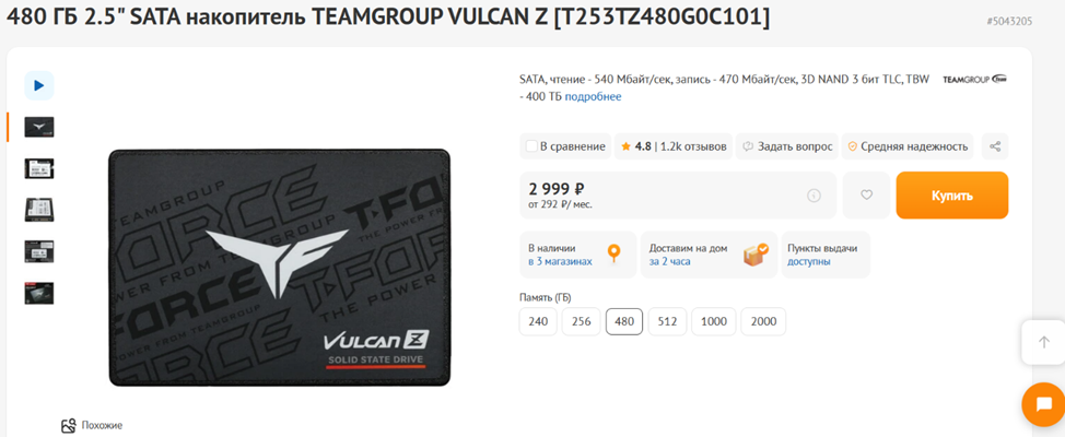 По-хорошему, твердотельный накопитель сразу нужно брать на терабайт, а лучше на два, ведь разъем M.2 PCI-Express у нас только один. Но если так сделать – не хватит денег на нормальную видеокарту. Поэтому изначально предлагаю приобрести полутерабайтный SATA III SSD, а в дальнейшем уже — купить нормальный терабайтник или двухтерабайтник стандарта PCI-E 3.0 или PCI-E 4.0, хотя в последнем смысла мало, с учетом того, какая выбрана материнская плата. Если только ради скоростей случайных чтения и записи. Так вот — на первом этапе можно взять, например, TEAMGROUP VULCAN Z — это очень бюджетный, но приличный по характеристикам накопитель. Надолго свободного места на нем не хватит, но вы как раз сможете подкопить денег и купить терабайтный ADATA Legend 800 или даже что-то побыстрее и подороже.