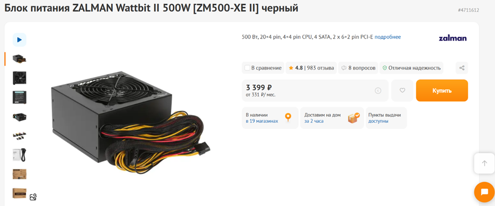 Комплектующие у нас нетребовательные, так что блока питания на честные 450-500 Вт хватит, причем с солидным запасом. В бюджетном ценовом сегменте нормальные блоки питания есть у Chieftec, Zalman, DeepCool и еще нескольких компаний. В свою очередь, некачественные БП можно найти под самыми разными брендами. В качестве варианта по-умолчанию предлагаю рассмотреть недорогой блок питания ZALMAN Wattbit II мощностью 500 Вт. По линии 12 В у него около 450 Вт — более, чем достаточно для AMD Ryzen 5 5600 и Radeon RX 7600. Конечно, рассчитывать на модульную или полумодульную систему подключения кабелей, «платиновый» или «титановый» КПД и подсветку не приходится, но с основными своими задачами выбранный БП должен справиться.