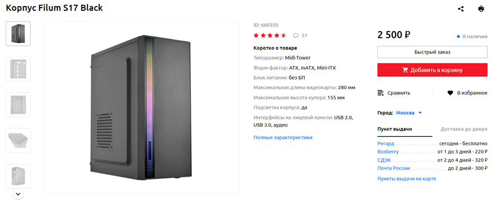 На корпус денег осталось совсем немного, но это не беда. Можно взять, например, Filum S17 и поставить сзади на выдув один 120-миллиметровый вентилятор. С учетом невысокого энергопотребления и тепловыделения нашей конфигурации, этого хватит для того, чтобы избежать перегрева. Для сверхбюджетного шасси характеристики у Filum S17 вполне приличные — даже видеокарты длиной до 280 мм и кулеры с радиаторами высотой до 155 мм установить можно. Показатели по меркам Midi Tower далеко не рекордные, но и, скажу прямо, не худшие и не близкие к худшим. Да и организация пространства неплохая – по крайней мере, лучше, чем у закрытых офисных «гробов» и корпусов начала двухтысячных. В общем, за свои деньги вариант достойный.