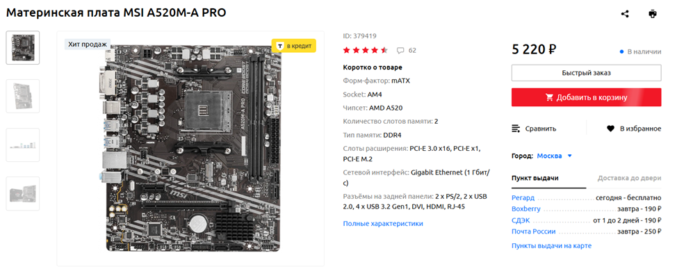 На материнской плате придется сэкономить, как и почти на всех других компонентах системы. Модель на чипсете B550 с двумя разъемами M.2 PCI-Express для нас непозволительная роскошь, ведь на видеокарту, SSD и другие комплектующие тоже нужны деньги. Так что будем довольствоваться возможностями начального чипсета, в том числе, третьей версией интерфейса PCI-Express. Неплохим вариантом за свои деньги будет, например, MSI A520M-A PRO. Да, это сверхбюджетная модель, но и наша конфигурация относится к начальному игровому сегменту, поскольку 60 тысяч рублей на момент написания статьи, это около 700-730 долларов. А даже 20 лет назад в среде компьютерщиков считалось, что на приобретение хорошего игрового ПК требуется бюджет, равный как минимум 1000 долларов.