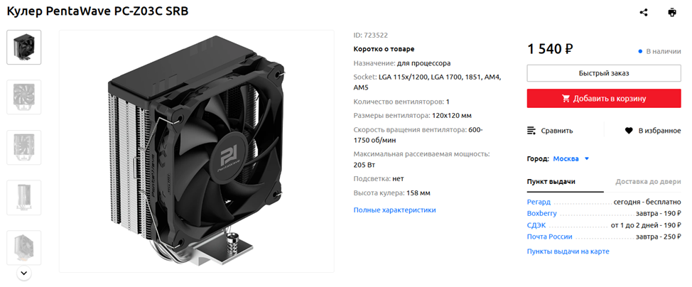 AMD Ryzen 5 5600 — это далеко не самый горячий и требовательный к системе охлаждения процессор, поэтому недорогого башенного кулера стоимостью 1500-2000 рублей нам хватит с лихвой. Такие кулеры есть в ассортименте ID-Cooling, DeepCool и многих других компаний, но сегодня в качестве варианта по-умолчанию хочу предложить PentaWave PC-Z03C SRB. Он не уступает условному DeepCool GAMMAXX 400 V2 в эффективности охлаждения, а стоит дешевле. Средних размеров радиатор, 2-4 теплотрубки, 120-миллиметровый вентилятор. этого более чем достаточно для отвода тепла от «пять тысяч шестисотого», а сэкономленные деньги можно вложить в другие комплектующие, ведь у нас на счету даже не каждая тысяча рублей, а каждая сотня. Но учтите. радиатор у модели PentaWave для своего сегмента достаточно высокий, 158 мм, так что он поместится далеко не в каждый бюджетный корпус.
