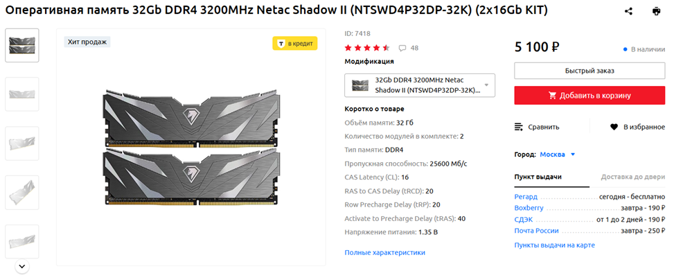 Еще не так давно, буквально несколько месяцев назад бюджета в 60 тысяч рублей не хватало даже для того, чтобы установить в сборку 32 гигабайта оперативной памяти. Приходилось предлагать взять одну планку на 16 гигабайт изначально и докупить вторую при первой возможности. К счастью, эти времена прошли, и, надеюсь, в ближайшее время не вернутся. Все-таки в 2025 году для гейминга 16 гигов уже недостаточно — нужно хотя бы 24, а лучше 32, чтобы с запасом. Благо, ОЗУ сильно подешевела и приличный комплект из пары шестнадцатигиговых планок можно взять всего за 5 тысяч рублей или чуть дороже. Вот неполный список хороших брендов: G.Skill, Kingston, Patriot, TeamGroup, XPG, ADATA, HP, Samsung, Crucial, Hynix, Micron, Silicon Power. Netac — тоже сойдет, хотя на российском рынке компания присутствует не так давно, как другие упомянутые фирмы.