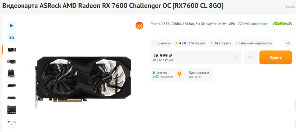 Возможностей Radeon RX 7600, как правило, достаточно для того, чтобы комфортно играть в современные игры на высоких, а часто даже максимальных настройках графики в разрешении FullHD, хотя и без трассировки лучей. Да, наличие только 8 гигабайт видеопамяти несколько ограничивает перспективы GPU, но модели с 16 гигабайтами стоят значительно дороже и уже не вписываются в наш бюджет. Да и на вторичном рынке интересных вариантов немного, разве что RTX 3060 с 12 гигабайтами памяти.