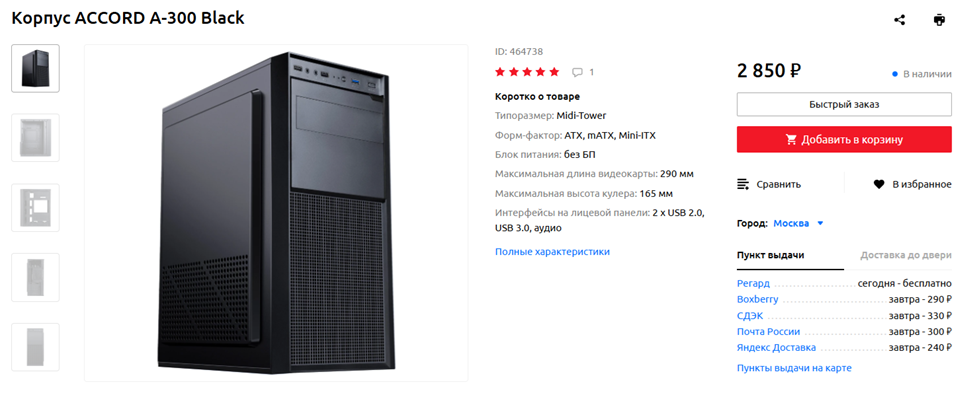 Итак, денег осталось на корпус классом «немного лучше картонной коробки». Благо, с учетом скромного тепловыделения выбранных комплектующих, такого шасси нам хватит. Лишь бы кулер влез — как-никак, высота его радиатора составляет аж 158 мм. Что можно подобрать в бюджете до 3 тысяч рублей? Ну, например, ACCORD A-300 — предустановленных вентиляторов не будет, но при необходимости докупить один-два — не проблема. Для сверхбюджетного корпуса модель можно охарактеризовать как достаточно просторную — в нее влезут видеокарты длиной до 290 мм и кулеры с радиаторами высотой до 165 мм. То, что нужно. Если же денег осталось побольше, и вы хотите взять что-то поприличнее, то можно присмотреться, например, к многочисленными решениям Zalman или чему-то более современному, вроде Powercase Mistral X4 за 4 тысячи рублей. Последний, кстати, оснащен аж четырьмя 120-миллиметровыми вентиляторами.