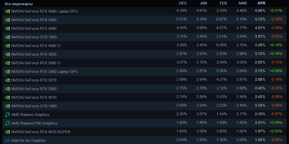 Не секрет, что наибольшей популярностью среди геймеров пользуются не флагманские или даже субфлагманские, а бюджетные игровые графические ускорители, такие, как GTX 1060, GTX 1660 в различных модификациях, RTX 3050, RTX 3060 и RTX 4060. Просто взгляните на статистику сервиса Steam. Увы, выбор в бюджетном и начально-среднем сегментах в последние годы, как правило, невелик — условная RTX 4060 против условной RX 7600, а все остальное — сильно дороже. При этом моделей RTX 4050 и RX 7500 производители так и не выпустили, хотя такие карты наверняка пользовались бы популярностью у нетребовательных геймеров, для которых не слишком важно качество графики, или которые предпочитают не самые новые игры.