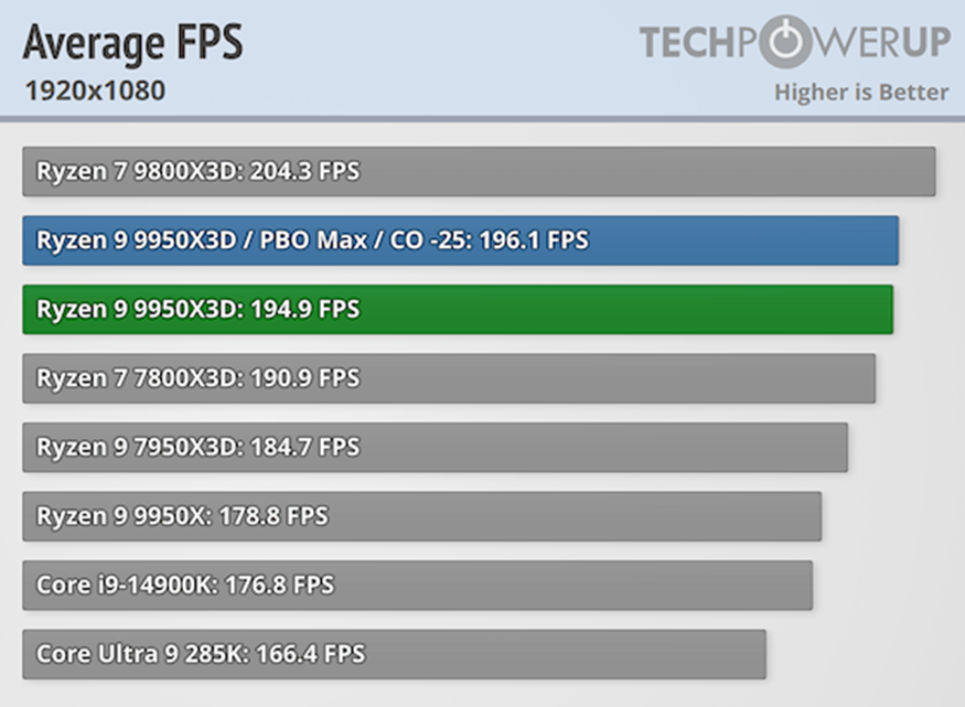 В некоторых играх лучше себя показывает 9950X3D, а в некоторых — 9800X3D. Чаще лидирует второй. Но разница, как правило, минимальна, 2-7%, поэтому выбирать из этих двух процессоров стоит, ориентируясь на бюджет, а также на предполагаемые сценарии использования ПК. Например, если вы планируете стримить и работать с видео, или в целом в каком-то ресурсоемком софте — однозначно стоит выбрать 9950X3D. Если же только играть — 9800X3D.