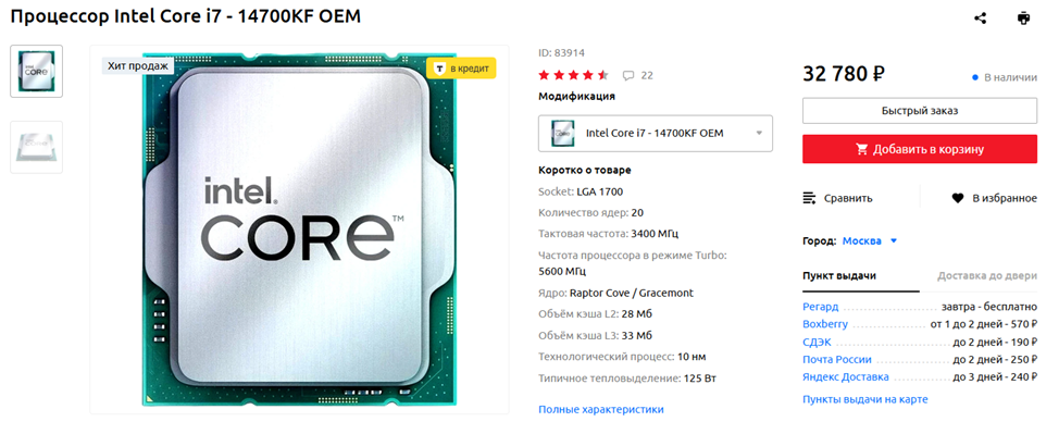 Intel Core i7-13700KF — это предшественник рассмотренного ранее 14700KF. У «тринадцать тысяч семисотого» столько же производительных ядер (8), но на 4 меньше энергоэффективных (то есть тоже 8), а также чуть ниже частоты. В играх данный процессор может обходиться воздушным суперкулером, а вот в бенчмарках и рабочих приложениях ему, как и 14700KF, требуется система жидкостного охлаждения. Лично у меня Core i7-13700KF уже пару лет работает в связке с Noctua NH-D15 — во время гейминга проблем нет, как и шума от кулера, а вот в стресс-тестах с AVX-инструкциями наступает троттлинг. В целом же, рассматриваемый CPU все еще актуален для игровых и стримерских конфигураций, и предлагается в российских магазинах по достаточно адекватным ценам. Вряд ли за те же деньги можно приобрести что-то лучше.