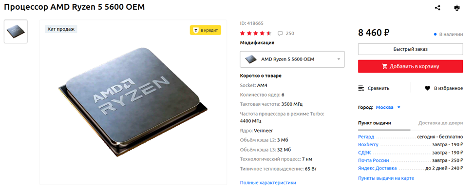 Начнем, как обычно, с процессора. Хорошим вариантом за свои деньги выглядит народный шестиядерник AMD Ryzen 5 5600 — его, конечно, можно назвать постепенно устаревающим, но пока не морально устаревшим, как Ryzen 5 3600. Всевозможные четырехъядерники не стоит даже рассматривать, а Core i5-12400F стоит на пару тысяч дороже, и это весомый аргумент с учетом нашего крайне ограниченного бюджета. К тому же, материнские платы для сокета AM4 с поддержкой PCI-Express 4.0 тоже можно найти дешевле, чем модели для платформы LGA 1700. Так что «пять тысяч шестисотый» — наш выбор. На несколько лет его должно хватить, а дальше в любом случае придется собирать новый ПК, поскольку системный блок с перспективой под будущий апгрейд на сокете AMD AM5 будет стоить намного дороже. Да и в целом, понятие апгрейда постепенно теряет свой смысл.