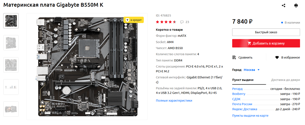 Материнскую плату очень желательно взять на чипсете B550 — ради уже упомянутой поддержки четвертой версии интерфейса PCI-Express. Это не вот прямо критично, но бонус к производительности видеокарты и твердотельного накопителя лишним явно не будет. Так что просто берем самую доступную B550 МП от проверенного временем производителя (ASUS/ASRock/GIGABYTE/MSI) с как минимум парой разъемов M.2 для SSD и не паримся. Мощная подсистема питания Ryzen 5 5600 не нужна — это весьма нетребовательный процессор. Что же касается разъемов — базовый набор USB-портов будет у любой материнской платы, так что переживать тут не о чем. В качестве варианта по умолчанию можно рассмотреть Gigabyte B550M K — это весьма доступное устройство, которое можно приобрести всего за 7-8 тысяч рублей. Хотелось бы еще дешевле, но цены на бюджетные МП снижаются довольно медленно.