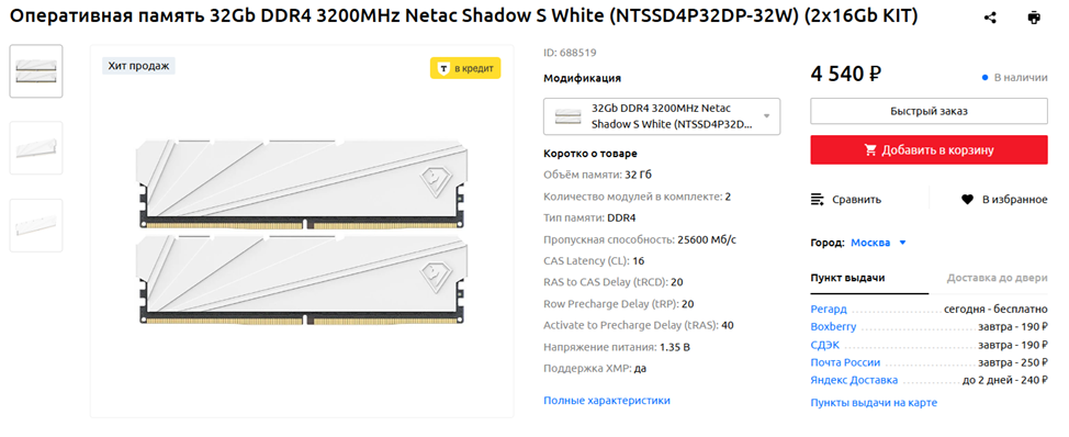 Оперативная память: 32Gb DDR4 3200MHz Netac Shadow S White (NTSSD4P32DP-32W) (2x16Gb KIT)