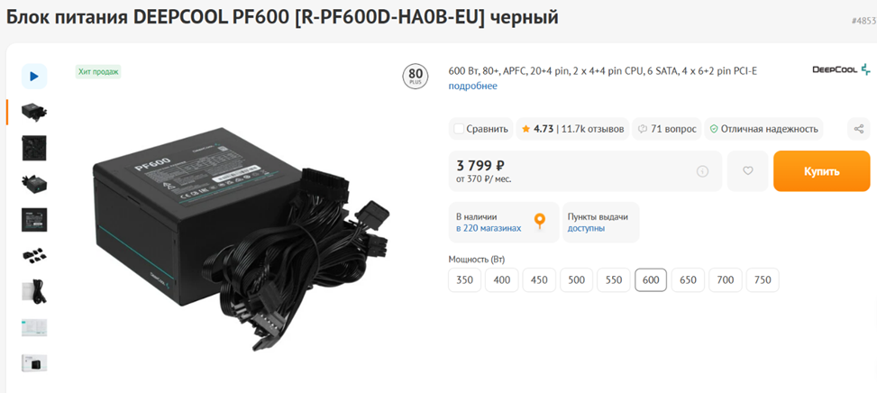 На блоке питания в случае сборки стоимостью 60 тысяч рублей можно и нужно экономить, но только в меру. Никаких БП ExeGate или Noname-китайцев. А вот недорогое, но качественное устройство от DeepCool, Chieftec или Zalman — хороший выбор. Мощности в 500-600 Вт для Ryzen 5 5600 и Radeon RX 7600 хватит с лихвой, так что можно взять, например, DeepCool PF600. Среди преимуществ модели — низкий уровень шума, достойные электрические характеристики, плоские черные кабели, которые удобно прокладывать внутри системного блока. А вот модульности или полумодульности нет — не тот ценовой сегмент. Впрочем, такие, как у DeepCool PF600 провода много места не занимают, особенно если грамотно использовать стяжки.