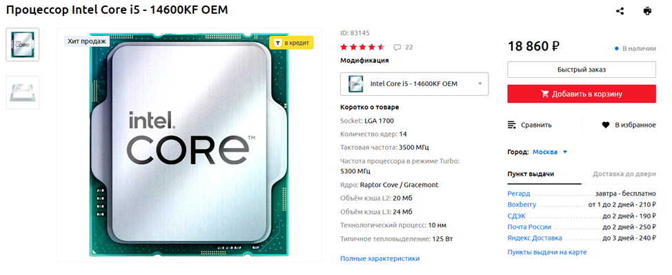 Начнем, как обычно, с процессора, и выбор тут, с учетом того, что больше половины бюджета уйдет на графический ускоритель, достаточно очевиден. Рекомендую взять Intel Core i5-14600KF — на момент написания статьи это лучший процессор до 20 тысяч рублей, причем безоговорочно лучший. Он оснащен шестью производительными ядрами с поддержкой мультипоточности и восемью энергоэффективными без таковой. Такая ядерная формула, а также высокие частоты позволяют «четырнадцать тысяч шестисотому» легко обгонять Ryzen 7 7700 и другие восьмиядерники из красного лагеря, не оснащенные 3D-кэшем, причем как в игровых, так и в рабочих сценариях использования.