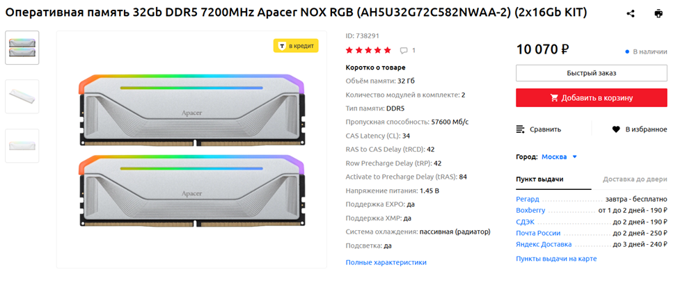 Оперативной памяти стоит сразу взять 32 гигабайта, причем не низкочастотной и не с конскими таймингами. Хорошим вариантом за свои деньги выглядит комплект DDR5-7200 Apacer NOX RGB 34-42-42. Пару лет назад такие наборы предлагались за 30 тысяч рублей, а сейчас их можно приобрести всего за 10. На самом деле, можно рассмотреть и вариант с 48 или 64 гигабайтами ОЗУ, но непосредственно для гейминга в ближайшие пару лет столько вряд ли понадобится. Если же вы, например, работаете с видео, то точно стоит добавить средств или на чем-то сэкономить, и купить комплект из двух 32-гиговых планок. Желательно, опять же, с адекватными частотой и таймингами. А вот чего я делать категорически не рекомендую — так это покупать оперативную память у непроверенных продавцов на маркетплейсах и в мелких интернет-магазинах. Очень уж много на рынке подделок.