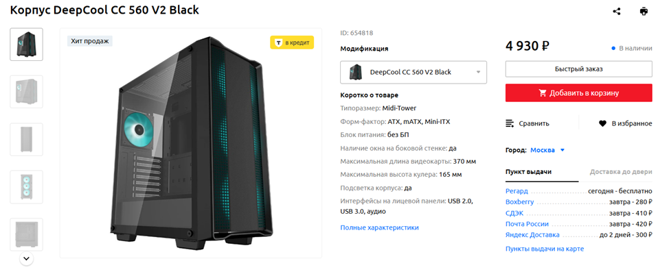 Железо у нас хоть и не экстремальное, но оно ощутимо горячее «среднего по больнице», так что корпус нужен просторный и продуваемый, но при этом не слишком дорогой — в районе 5-6 тысяч рублей. Отлично подойдет DeepCool CC 560 V2 с четырьмя предустановленными вентиляторами — туда можно впихнуть и более крупные видеокарты/кулеры, чем наши. А еще шасси вполне современно выглядит, хотя исполнение фронтальной панели понравится не всем. Пылевые фильтры сверху и снизу, а также система прокладки кабелей — в наличии. Ну и прозрачная стенка — она выполнена из закаленного стекла, а не из акрила. Проще говоря, с учетом стоимости, DeepCool CC 560 V2 — это достойный игровой корпус, который можно смело использовать для конфигураций с высокими показателями энергопотребления и тепловыделения.