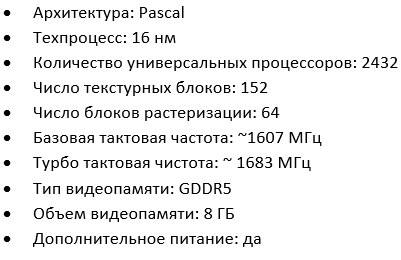 GTX 1070 Ti производительнее и энергоэффективнее, чем флагман предыдущего поколения, GTX 980 Ti, если же не пренебрегать разгоном, данный графический ускоритель опередит и GTX 1080. Также улучшенная «тысяча семидесятая» легко обходит базовую версию GTX 1660, а в некоторых играх даже GTX 1660 Ti и GTX 1660 Super – неплохая заявка, не правда ли? Конечно, на вторичке карточка стоит довольно дорого, но, если она исправна, то отлично подойдет для игровой сборки: в Cyberpunk 2077 и Red Dead Redemption 2 на средних можно рассчитывать на 70+ FPS, а в большинстве менее ресурсоемких хитов – смело ставить максимальные параметры графики.