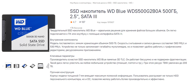 Возвращаемся в Ситилинк. Автор пишет о том, что твердотельный накопитель не подвержен фрагментации, но это упоминание столь же «полезно», как информация на этикетке подсолнечного масла о том, что оно «без холестерина и содержит витамин Е». Для тех, кто в танке, семена подсолнечника в принципе не могут содержать холестерина и всегда содержат витамин Е. Иногда доходит и до совсем откровенного бреда, когда потребителю предлагают пищевую соль «без ГМО», здесь мы тоже наблюдаем нечто подобное. Так вот – SSD в принципе не нуждаются в дефрагментации, в отличие от магнитных накопителей (жестких дисков). Не несет никакого смысла и информация о том, что модель работает бесшумно – в ней нет движущихся частей, откуда взяться шуму? Много вы знаете шумных SSD?