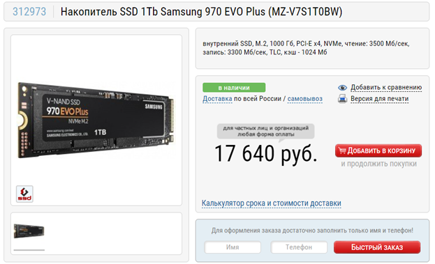 SSD: Samsung 970 Evo Plus 1 ТБ