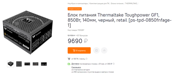 Блок питания стоит покупать с запасом по мощности хотя бы в 20% сверх используемой, а лучше – в 30%. Среди качественных моделей, предлагающихся по адекватной цене, можно выбрать, например, Thermaltake Toughpower GF1 на 850 Вт. К его преимуществам относятся неплохой КПД и превосходная стабильность напряжений, высокая нагрузочная способность канала +12VDC, гибридная система охлаждения и возможность подключать только нужные кабели. Также стоит отметить использование надежных конденсаторов (преимущественно от компаний Nichicon и Nippon Chemi-Con) и невысокий уровень шума при любом уровне нагрузки, кроме максимального или околомаксимального. Придраться здесь особенно не к чему, дополнительным же бонусом от производителя идет десятилетняя гарантия. Отличный вариант за свои деньги – такой БП может пережить не одну сборку.